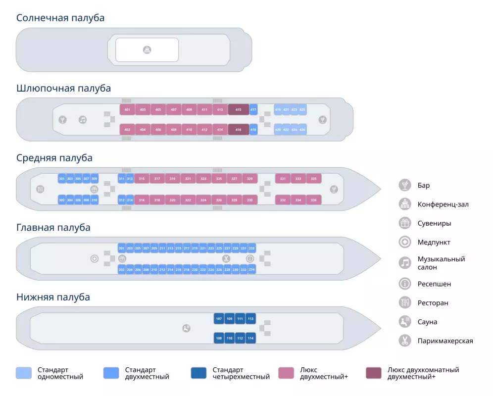 Каюты теплохода оборудованы открывающимися окнами (кроме кают на Нижней палубе). Оснащение кают: душ/туалет, индивидуальная система климат-контроля, мини-холодильник, сейф, телевизор с плоским экраном, радио, а в каютах класса «Люкс» есть также и фены. Вас приятно удивит высокий уровень сервиса в ресторане и барах. Приглашаем вас посетить сувенирный магазин, парикмахерскую и сауну. Вы сможете расслабиться и пообщаться с друзьями на солнечной палубе с бассейном и местами для загара. На борту имеется и кабинет врача.