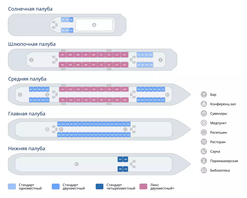 Уютный ресторан, обладающий неповторимой тёплой атмосферой, предлагает широкий выбор блюд традиционной русской и изысканной континентальной кухни. В свободное время Вы сможете расслабиться и пообщаться с друзьями в одном из двух баров или на солнечной палубе, посетить сувенирный магазин или салон-парикмахерскую. На борту теплохода имеется сауна и кабинет врача. На протяжении многих лет теплоход работал с иностранными туристами.