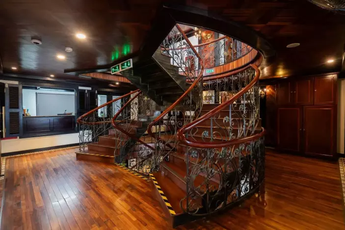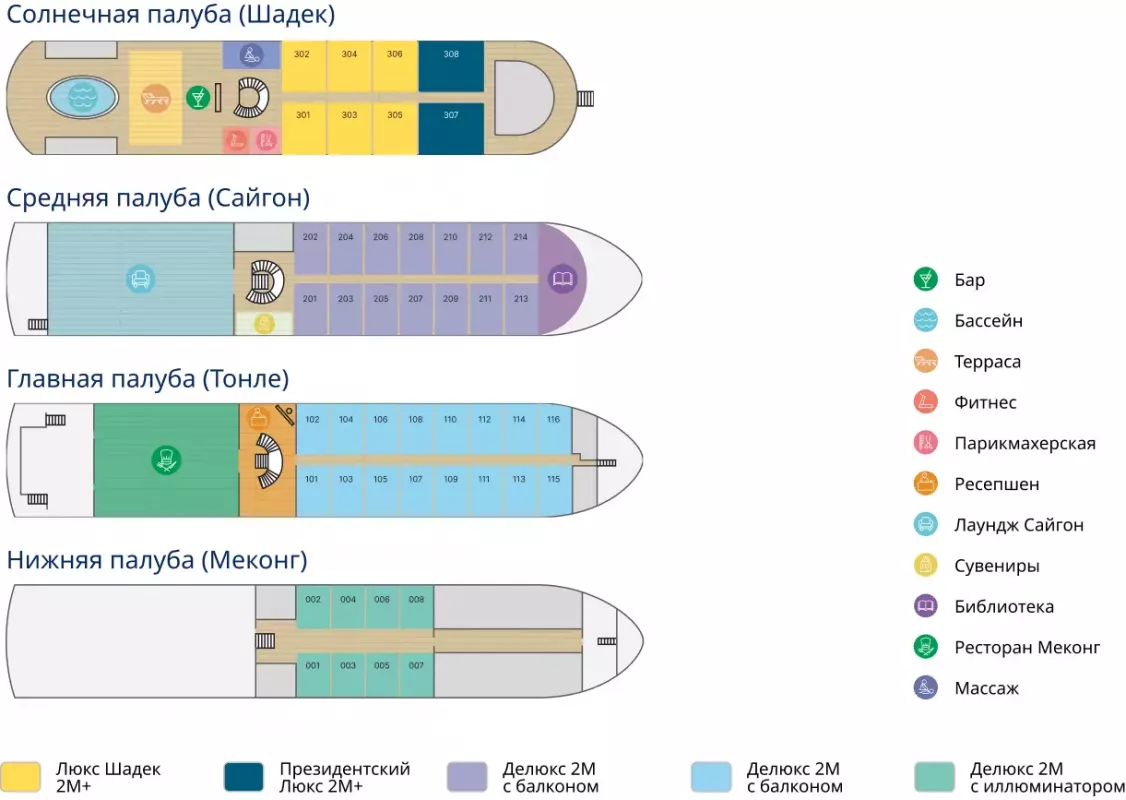 46 просторных кают с панорамными окнами и балконами, изысканная кухня с блюдами вьетнамской и камбоджийской кухни, спа-салон – всё создано для того, чтобы вы чувствовали себя по-королевски.
