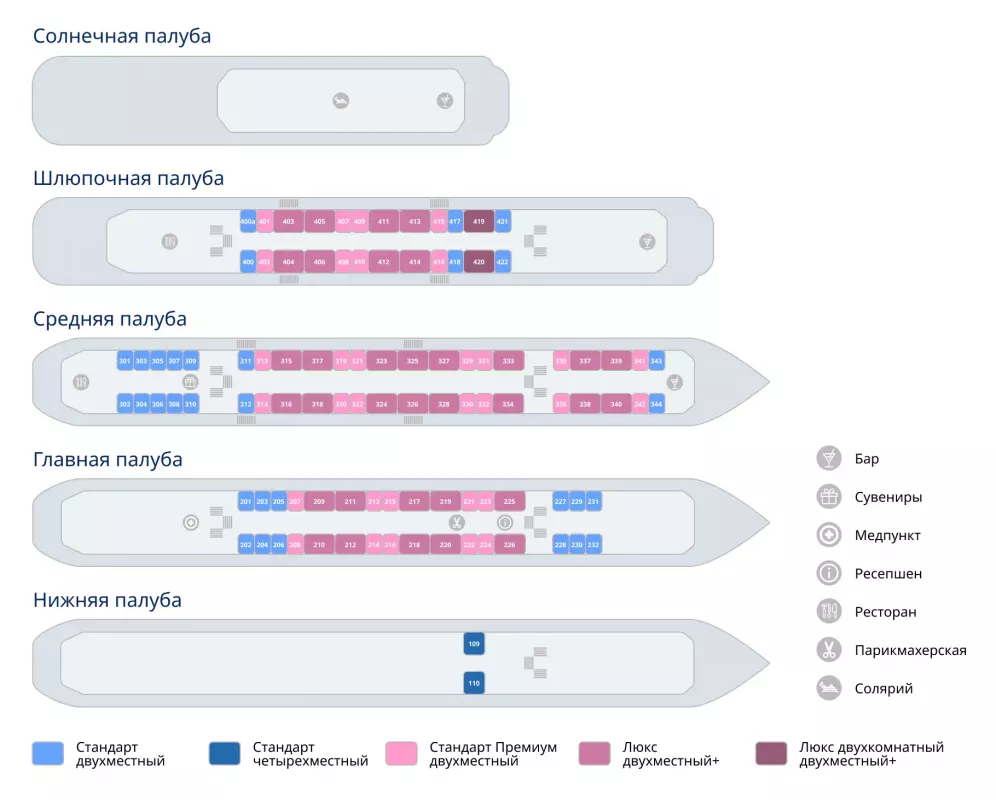 Теплоход рассчитан на прием 208 пассажиров, для размещения которых представлены 102 комфортабельные каюты. Все каюты теплохода являются внешними и оборудованы открывающимися окнами. Каюты оснащены системой индивидуального климат-контроля, радио, телевизором, сейфом, встроенным платяным шкафом, а в каютах класса «Стандарт премиум двухместный+» и «Полулюкс двухместный+» есть также мини-холодильники и фены.